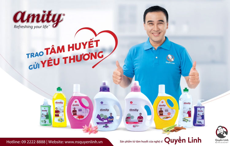Amity chính là sản phẩm đến từ trái tim, được bảo chứng bởi hình ảnh và uy tín của chính Nghệ sỹ Quyền Linh với các sản phẩm: nước rửa chén, nước lau sàn, nước rửa tay, nước giặt xả … đem lại khả năng tẩy rửa vượt trội, hỗ trợ công việc chăm sóc gia đình hằng ngày với các đặc tính riêng biệt, giá thành hợp lý như: