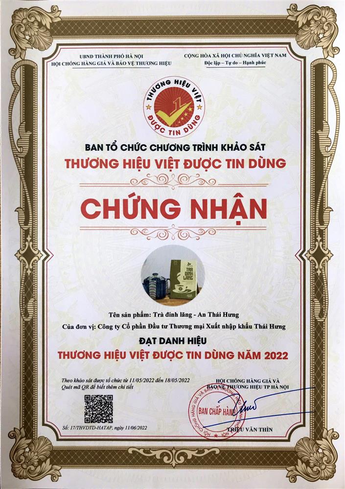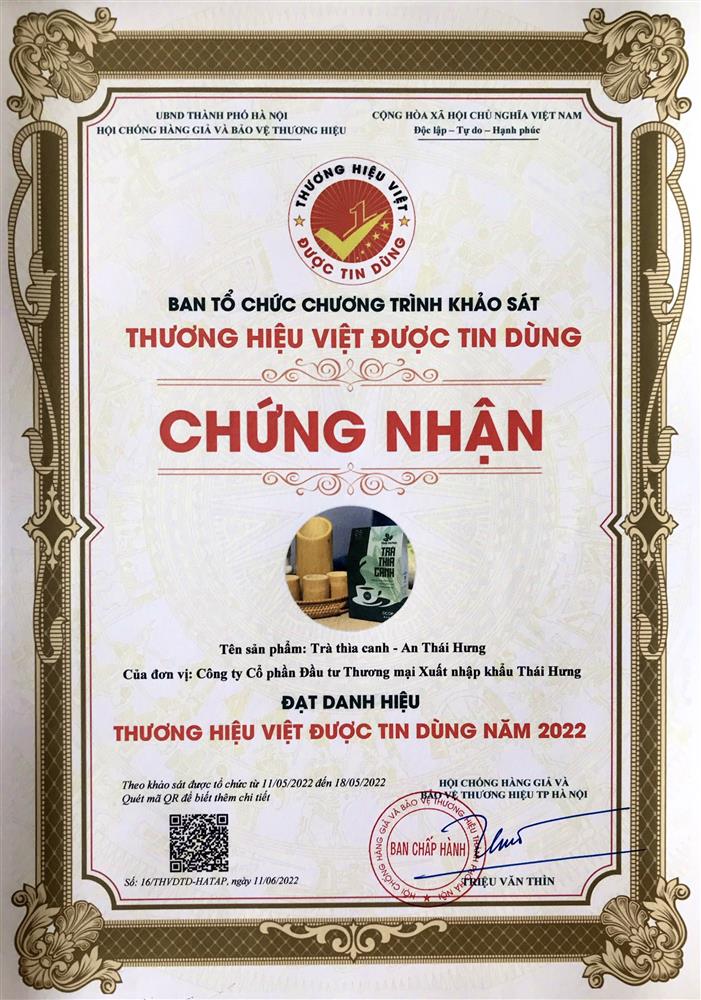 Từ ngày 23/05/2022 đến 31/05/2022, ba sản phẩm Trà của Công ty Cổ phần Đầu tư Thương mại XNK Thái Hưng tham gia khảo sát “Thương hiệu Việt được tin dùng” kết quả khảo sát cụ thể như sau:
