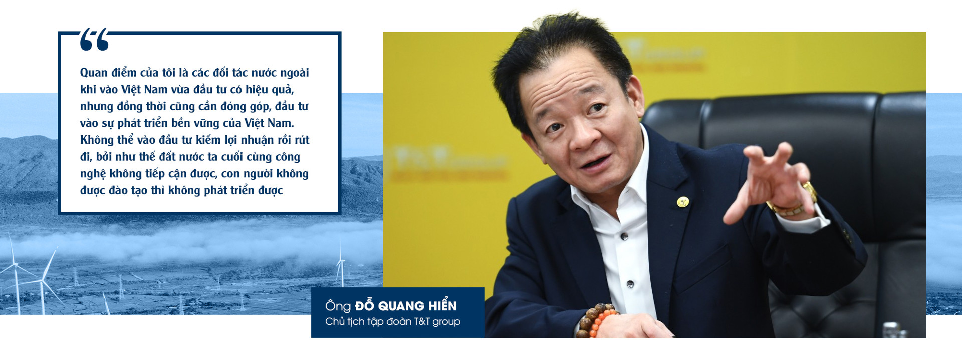 Tôi luôn đau đáu và tìm hiểu, nghiên cứu và đặt vấn đề hợp tác với một số đối tác để phát triển NLTT. Đồng thời, cũng có ý kiến với cơ quan quản lý của nhà nước dần dần đưa NLTT vào trong quy hoạch phát triển ngành điện. Tuy nhiên, chúng tôi cũng nhận thấy rằng việc này cần có lộ trình, bởi nếu làm sớm quá thì giá điện mặt trời, điện gió rất cao, chưa phù hợp với mức thu nhập của đại đa số người dân Việt Nam. Cũng rất may trong 10 năm qua bản thân tôi, cũng như Tập đoàn T&T đã có nghiên cứu, tìm hiểu, hợp tác với một số đối tác, đồng thời hoạch định chiến lược phù hợp với chủ trương, chính sách của Chính phủ, của Nhà nước khi mở rộng quy hoạch NLTT, kịp thời đăng ký tham gia và đầu tư. Hiện nay Tập đoàn T&T đã đầu tư vào các dự án điện mặt trời, điện gió trên bờ công suất gần 2.000 MW, đã hòa lưới điện quốc gia được xấp xỉ 1.000 MW.