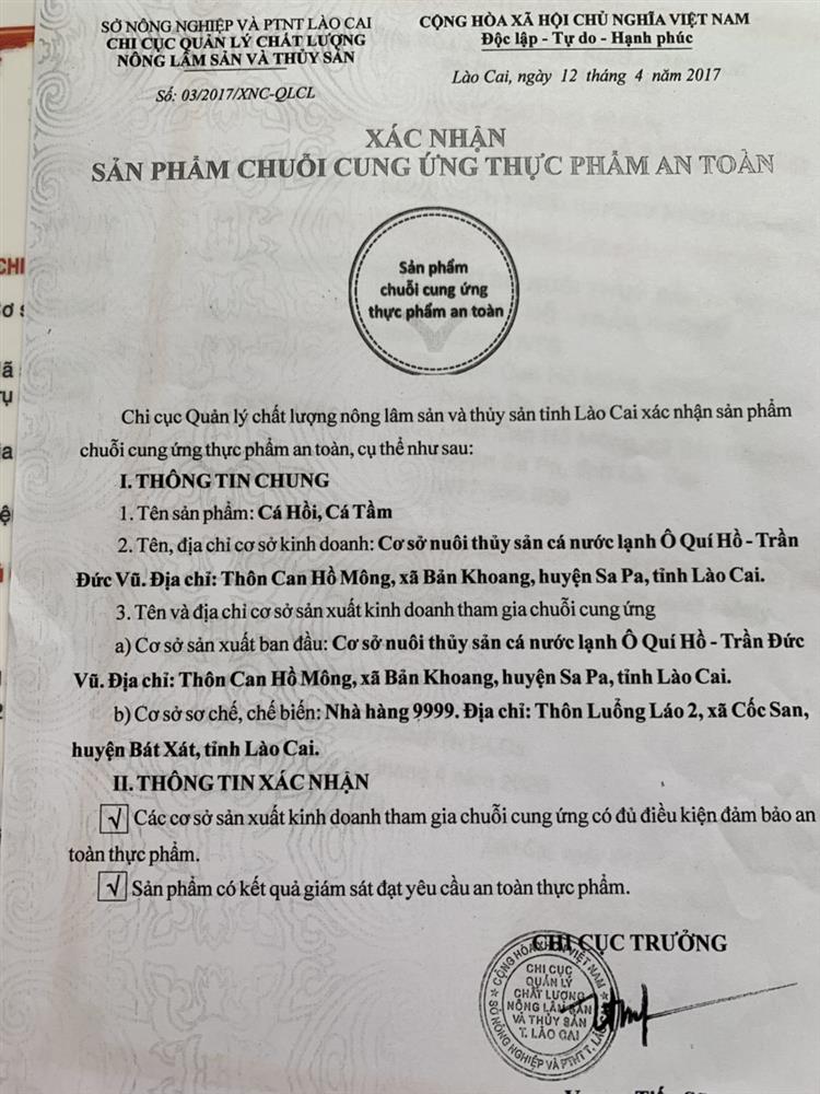 Cá hồi vân được nuôi đúng quy chuẩn và được chứng nhận sản phẩm an toàn của bộ nông nghiệp và phát triển nông thôn. Hiện tại, cơ sở ngoài bán sống, cơ sở tập trung xây dựng cơ sở vật chất, nghiên cứu sản xuất ra sản phẩm ruốc cá hồi và cá hồi hun khói. Để có thể đáp ứng những nhu cầu của khách hàng trên toàn quốc.