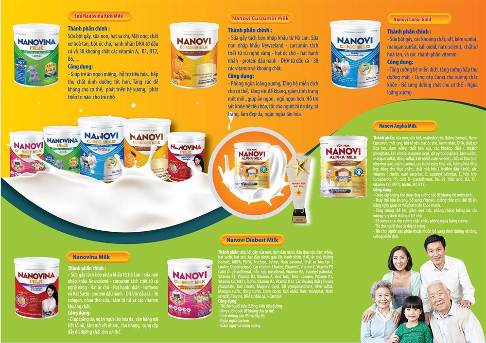 Hiện nay, Nanovi Việt Nam tự hào là nhà cung cấp sữa đa dạng, phục vụ cho nhiều đối tượng khác nhau trong độ tuổi từ 3 tuổi trở lên, 19 tuổi trở lên và sản phẩm dành chung cho mọi lứa tuổi. Trong đó sản phẩm dành cho chế độ ăn đặc biệt gồm tinh chất sữa bột Nanovi Milk Curcumin, sữa non hàm lượng cao Nanovi Alpha Milk, sữa trẻ em, sữa dành cho người ăn kiêng, tiểu đường, sữa cân bằng nội tiết tố nữ và sữa Nanovi Canxi Gold đã giúp Nanovi Việt Nam ngày càng khẳng định vị thế vững chắc trên thị trường.