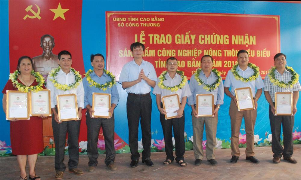 Anh Nguyễn Quang Quyền (thứ 3 từ phải sang) được Sở Công thương tỉnh Cao Bằng trao giấy chứng nhận là sản phẩm công nghiệp nông thôn tiêu biểu cấp tỉnh, năm 2018.