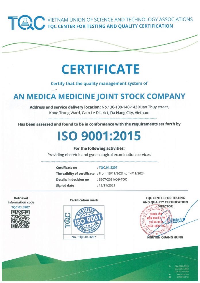 Vượt qua các tiêu chí đánh giá của tổ chức Trung tâm Kiểm nghiệm và Chứng nhận Chất lượng (TQC), An Clinic (thuộc Công ty CP Y khoa An Medica) - Phòng khám sản phụ khoa đầu tiên tại Đà Nẵng đạt chứng chỉ ISO 9001 với mô hình đạt chất lượng cao theo chuẩn Châu Âu.
