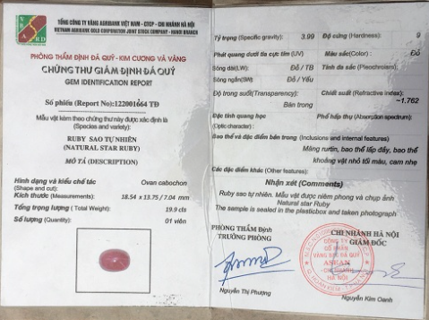 Ruby sao Thiên Vương đã được Phòng thẩm định đá quý giám định