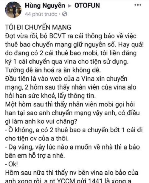 Tài khoản Hùng Nguyễn đã đăng thông tin bị nhà mạng Mobifone "cố tình" gây khó dễ khi anh muốn chuyển đổi nhà mạng
