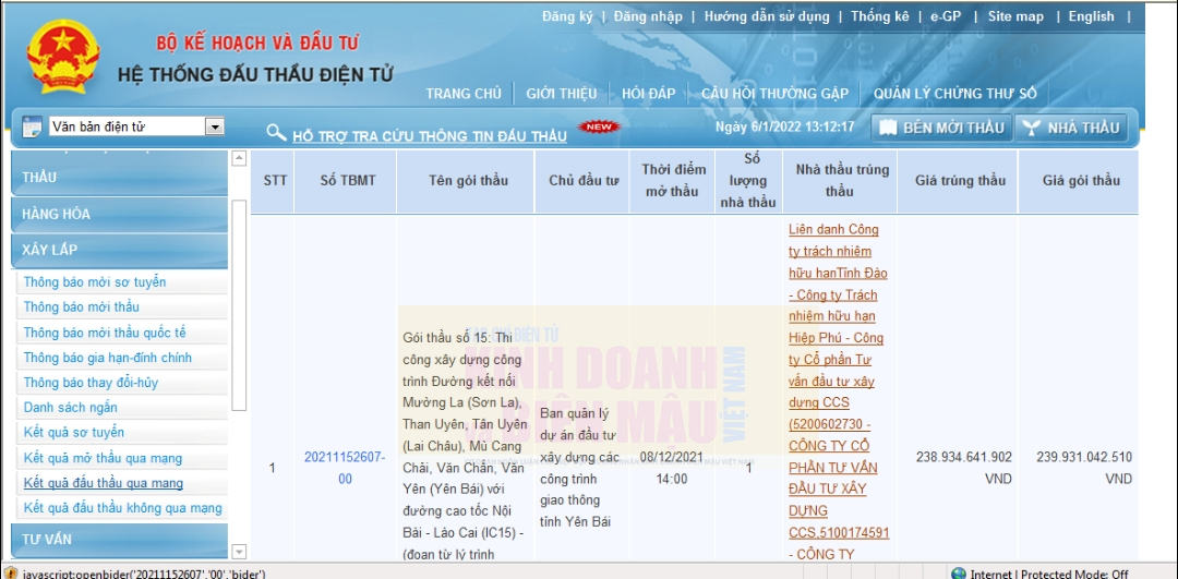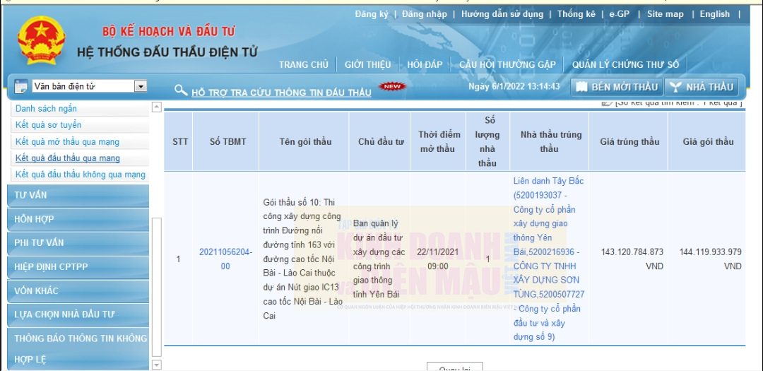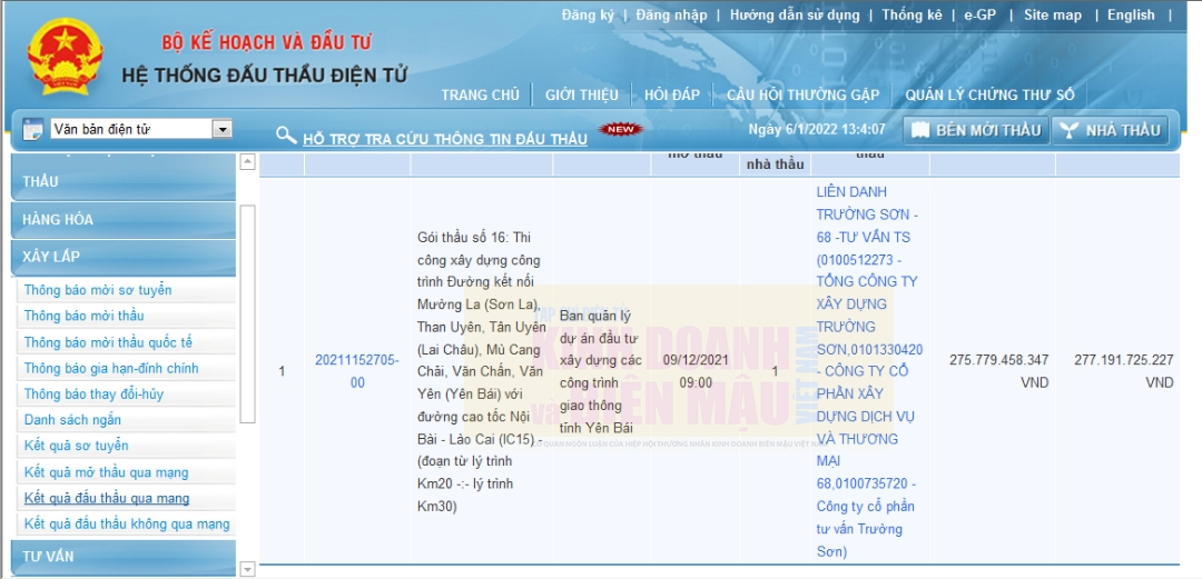 Cụ thể là tại gói thầu số 14: Thi công xây dựng công trình Đường kết nối Mường La (Sơn La), Than Uyên, Tân Uyên (Lai Châu), Mù Cang Chải, Văn Chấn, Văn Yên (Yên Bái) với đường cao tốc Nội Bài - Lào Cai (IC15) - (đoạn từ lý trình Km0 -:- lý trình Km 10), liên danh Công ty CP Xây dựng giao thông Yên Bái - Công ty CP Xây dựng Thịnh Hưng Yên Bái - Công ty TNHH Đồng Tiến - Công ty CP Đầu tư xây dựng và Thương mại Nam Phong - Công ty CP Tư vấn đầu tư xây dựng CCS là đơn vị duy nhất dự thầu qua mạng và sau đó được phê duyệt trúng thầu với giá 328.662.143.000 đồng theo Quyết định số 366/QĐ-BQLDA ngày 20/12/2021 do ông Trần Xuân Cường, Giám đốc Ban Quản lý dự án đầu tư xây dựng các công trình giao thông tỉnh Yên Bái ký.
