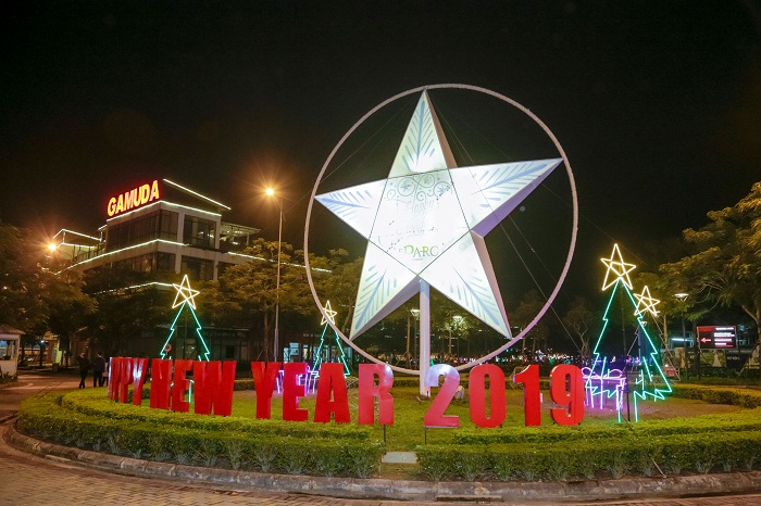 Điểm nhấn của xứ sở ánh sáng là ngôi sao băng màu trắng khổng lồ cao tới 20m, bên dưới có dòng chữ lớn “Happy New Year 2019” được đặt ở vị trí trung tâm của lễ hội ánh sáng.
