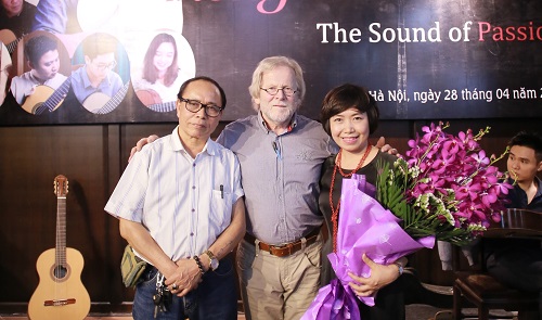 Nghệ nhân Anton Wiegers (giữa), Bùi Lệ Hương ôm hoa (phải) chụp ảnh cùng ảnh lưu niệm trong một chương trình biểu diễn tại Hà Nội