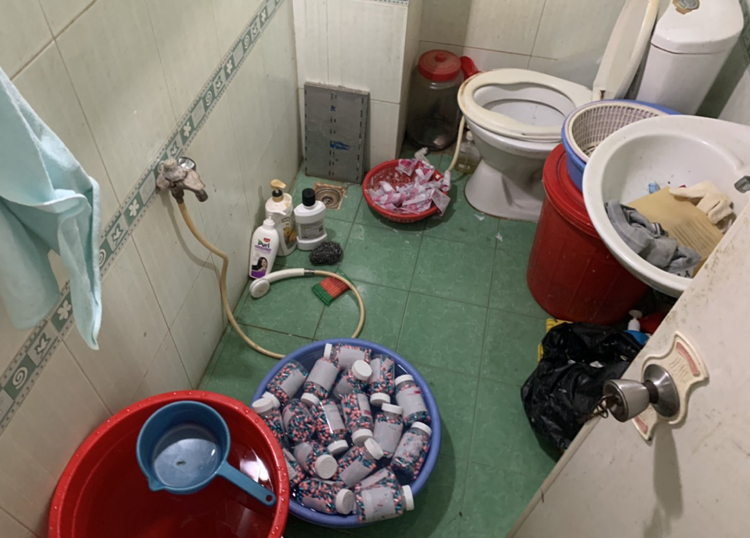 Khám xét khẩn cấp tại 3 địa điểm là nơi sản xuất, tàng trữ, buôn bán thuốc tân dược giả tại các quận Phú Nhuận, Tân Bình, Quận 8, Công an phát hiện khu vực sản xuất thuốc giả là nhà vệ sinh dơ bẩn, thuốc được để ngay dưới nền nhà.