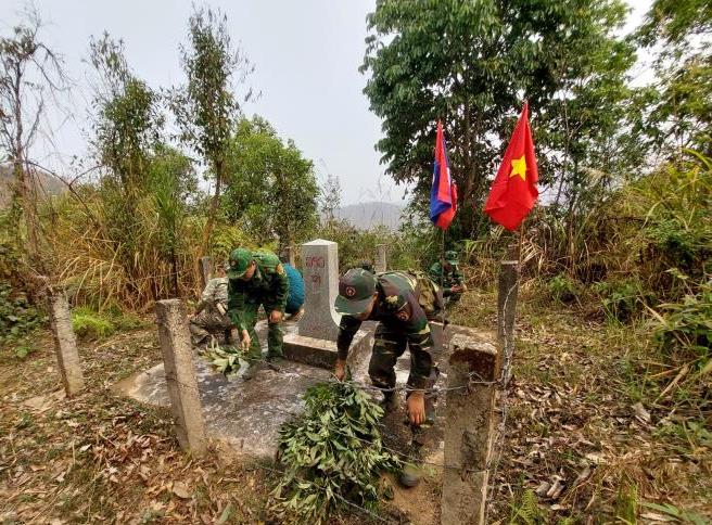 Cán bộ, chiến sĩ hai đơn vị làm vệ sinh khu vực xung quanh cột mốc. Ảnh: Anh Dũng