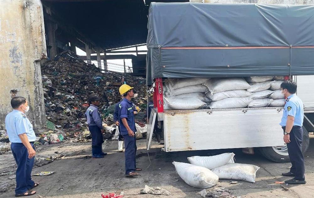 Đội Quản lý thị trường số 12, Chi cục Quản lý thị trường tỉnh An Giang giám sát việc tiêu hủy phân bón nhập lậu, không rõ nguồn gốc, xuất xứ.