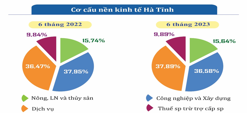 Về cơ cấu kinh tế 6 tháng đầu năm 2023 khu vực nông, lâm nghiệp và thủy sản chiếm 15,64%, giảm 0,1 điểm % so với cùng kỳ năm 2022; khu vực công nghiệp và xây dựng chiếm 36,58%, giảm 1,37 điểm % (trong đó, ngành Công nghiệp chiếm 28,35%, giảm 2,18 điểm %; ngành xây dựng chiếm 8,23%, tăng 0,81 điểm %); khu vực Dịch vụ chiếm 37,89%; tăng 1,42 điểm %; thuế sản phẩm trừ trợ cấp sản phẩm chiếm 9,89%, tăng 0,05 điểm % so với cùng kỳ năm trước.