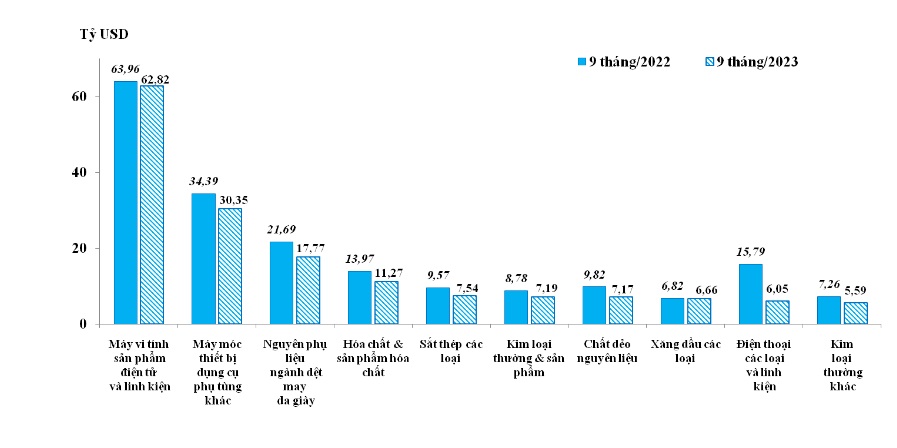 Quy mô nhập khẩu hàng hóa trong 9 tháng/2023 giảm 38,76 tỷ USD so với cùng kỳ năm trước. Trong đó, giảm mạnh nhất là nhóm hàng điện thoại các loại và linh kiện giảm 9,74 tỷ USD; máy móc, thiết bị, dụng cụ và phụ tùng giảm 4,04 tỷ USD; chất dẻo nguyên liệu giảm 2,64 tỷ USD; sắt thép các loại giảm 2,03 tỷ USD; vải các loại giảm 1,86 tỷ USD; kim loại thường khác giảm 1,66 tỷ USD; hóa chất giảm 1,57 tỷ USD; linh kiện phụ tùng ô tô giảm 1,37 tỷ USD; máy vi tính, sản phẩm điện tử và linh kiện giảm 1,14 tỷ USD; sản phẩm hóa chất giảm 1,13 tỷ USD. Tính chung 10 nhóm hàng này đã giảm 27,2 tỷ USD so với cùng kỳ năm trước.