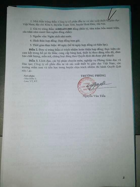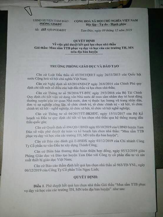 Trước đó, ngày 09/12/2019 ông Nguyễn Văn Tiến, Trưởng Phòng Giáo dục và Đào tạo huyện Tam Đảo cũng ký quyết định số 119/QĐ-GD&ĐT phê duyệt kết quả lựa chọn nhà thầu tại gói thầu: “Mua sắm TTB phục vụ dạy và học của các trường TH, MN trên địa bàn huyện”. Đơn vị trúng thầu là Công ty cổ phần đầu tư và sản xuất thiết bị giáo dục Việt Nam (địa chỉ tại quận Cầu Giấy, Hà Nội) với giá 4.840.655.000 đồng (giá gói thầu là 4.845.512.000 đồng).