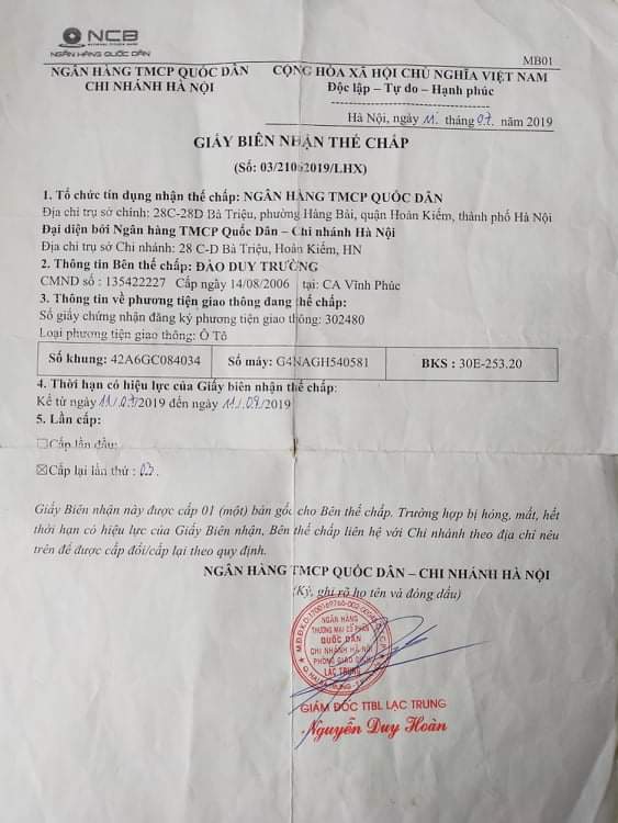 Một chiếc xe mang BKS:30E-253.20 được thế chấp tại Ngân hàng NCB