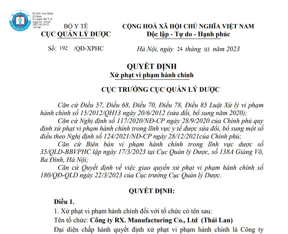 Cụ thể, Cục Quản lý dược (Bộ Y tế) đã ra quyết định xử phạt vi phạm hành chính đối với Công ty RX. Manufacturing Co., Ltd (Thái Lan) do sản xuất thuốc vi phạm chất lượng ở mức độ 2.