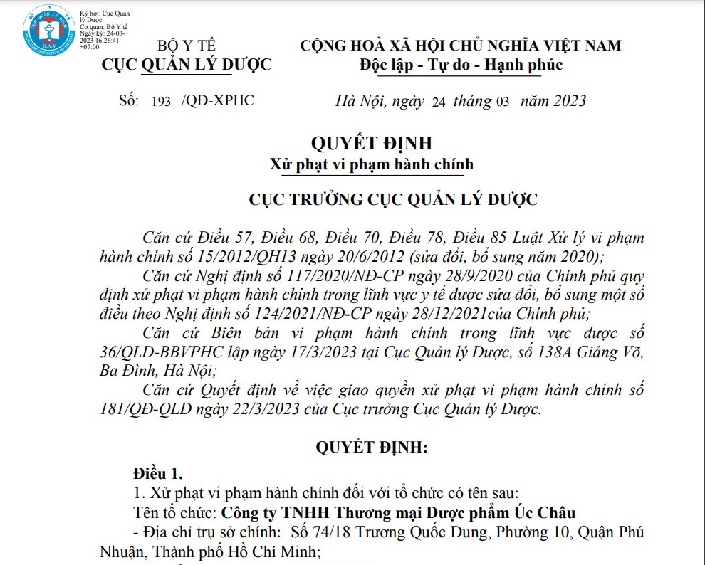 Quyết định xử phạt Dược phẩm Úc Châu (Ảnh chụp Quyết định)