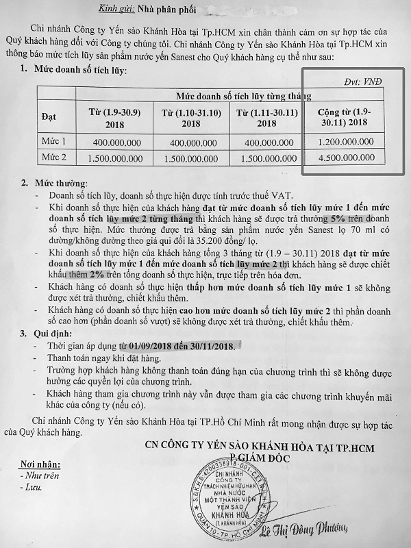 Như vậy, thay vì trả 5% của doanh số là trên 145 triệu đồng, Yến sào Khánh Hòa chỉ hứa trả hơn 87 triệu đồng, đã khiến nhà phân phối bị thiệt thòi không nhỏ về quyền lợi. Đáng nói hơn, Yến sào Khánh Hòa hứa cuối năm 2017 sẽ trả số tiền trên nhưng đến nay, cuối năm 2018, công ty vẫn im hơi lặng tiếng. Bà Tuyền đã nhiều lần liên hệ lãnh đạo công ty nhưng không nhận được câu trả lời.