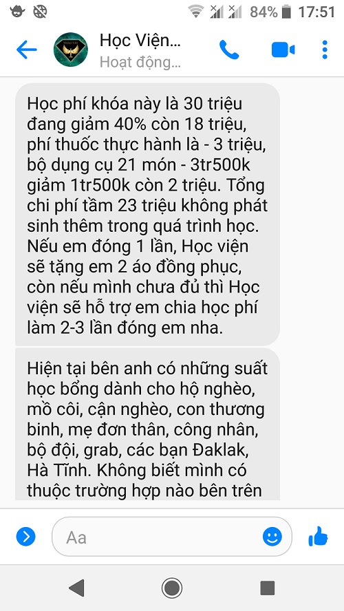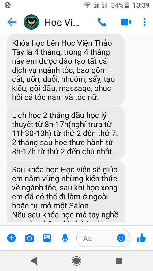 Vào vai người đang có nhu cầu học nghề, PV đã liên hệ với fanpage của Học viện tóc Quốc tế Thảo Tây và bày tỏ mong muốn được tìm hiểu về các khóa học, ngay lập tức PV nhận được sự “chăm sóc” nhiệt tình của nhân viên Học viện.