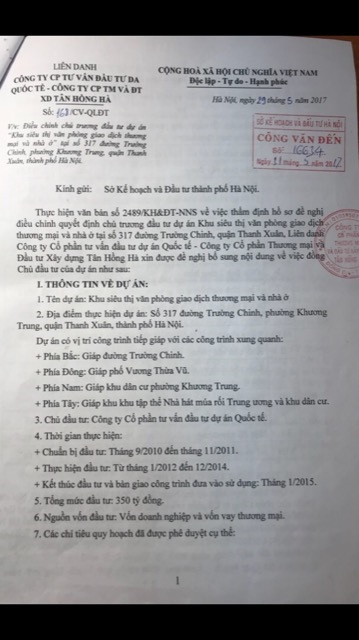 Ví dụ: Văn bản số 125/2017/ICC ngày 12/4 về việc đề nghị điều chỉnh quyết định chủ trương đầu tư Dự án 317 Trường Chinh mà Công ty ICC gửi UBND TP. Hà Nội và Sở Kế hoạch - Đầu tư do ông Phạm Xuân Đức, Tổng Giám đốc ICC ký đã bị ông Nguyễn Minh Khoa làm giả để gửi Sở Kế hoạch - Đầu tư. Điều đáng nói là khi ký Văn bản này với chức danh Chủ tịch HĐQT Công ty ICC, ông Khoa lúc đó đã bị HĐQT Công ty ICC phế truất chức danh này. Đương nhiên, con dấu đóng trên văn bản này là dấu giả. Ngạc nhiên hơn, cũng vẫn từ Văn bản số 125 này, tại bản nộp làm chứng cứ gửi cho Tòa án, ông Khoa lại sử dụng danh nghĩa Liên danh Công ty ICC và Tân Hồng Hà để ký vào Văn bản. Điều đó cho thấy, chỉ cùng một Văn bản mà ông Khoa đã “chế biến” thành hai Văn bản giả khác nhau, được đóng bằng hai con dấu giả khác nhau, gửi cho hai cơ quan khác nhau, trong đó nguy hiểm hơn là một bản dùng làm chứng cứ giao nộp cho Tòa án (Bút lục 178b). Đây là bằng chứng thể hiện rõ hành vi bất chấp pháp luật của ông Nguyễn Minh Khoa, kể cả khi đối diện với cơ quan bảo vệ pháp luật (Tòa án - PV).