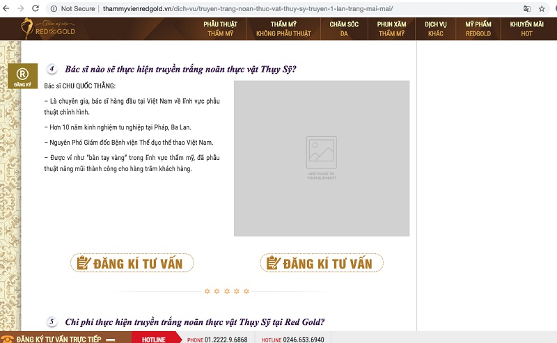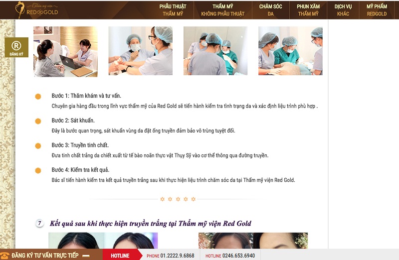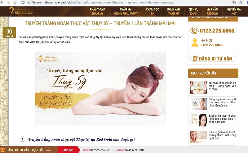 Cụ thể trên website có địa chỉ http://thammyvienredgold.vn/cham-soc-da/trang-da/ TMV Red & Gold ngang nhiên quảng cáo hai phương pháp là truyền trắng noãn thực vật Thuỵ Sỹ và Tiêm trắng Hàn Quốc. Cùng với đó là lời quảng cáo có cánh: Thẩm mỹ viện Red Gold là một trong số ít cơ sở thẩm mỹ trên toàn quốc được Bộ Y tế cấp giấy phép hoạt động trong lĩnh vực thẩm mỹ. Chúng tôi có đầy đủ tính pháp lý và đội ngũ y bác sĩ tu nghiệp trong nước và quốc tế để đem đến kết quả hài lòng nhất cho khách hàng.Quy trình thực hiện truyền trắng tế bào noãn thực vật Thụy Sỹ bao gồm những bước: thăm khám và tư vấn, sát khuẩn. truyền tinh chất và kiểm tra kết quả.
