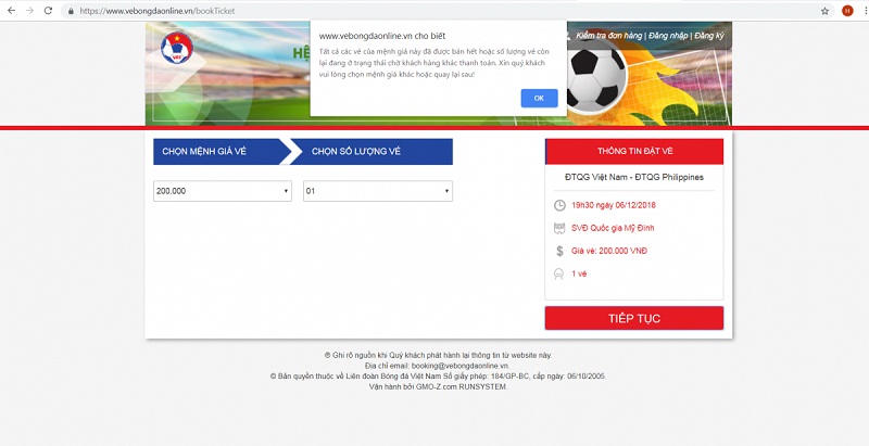 Tuy nhiên, ngay từ 10h00, khi những khán giả cuồng nhiệt bóng đá truy cập vào 1 trong 4 địa chỉ được cung cấp và đều được dẫn về một trang duy nhất là https://www.vebongdaonline.vn/ và tiến hành đặt vé thì đều nhận được thông báo của hệ thống đặt vé là "Tất cả vé của mệnh giá này đã được bán hết hoặc số lượng vé còn lại đang ở trạng thái chờ khách hàng khác thanh toán..."