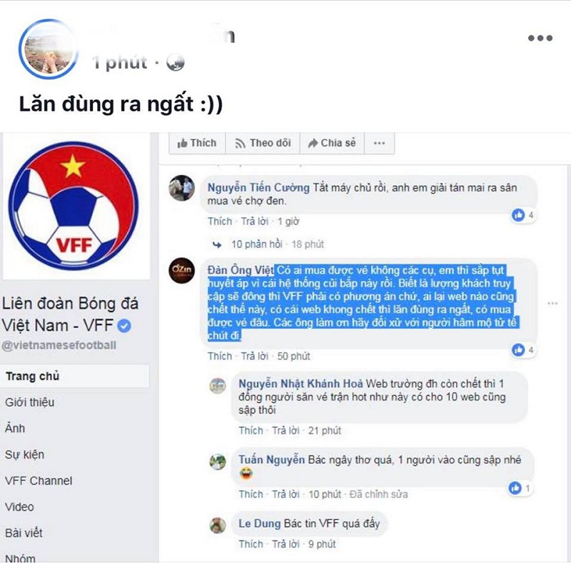 Ngay sau đó, là hàng loạt những phản hồi, bức xúc của cư dân mạng khi không thể đặt mua vé online theo những thông tin mà VFF đưa ra.