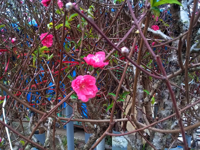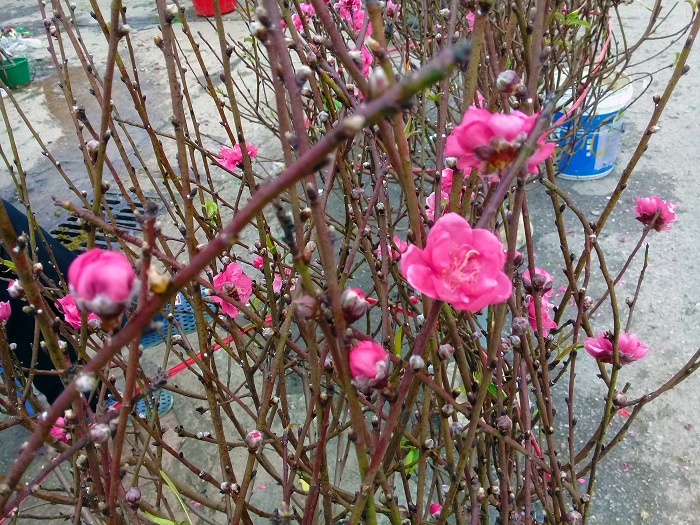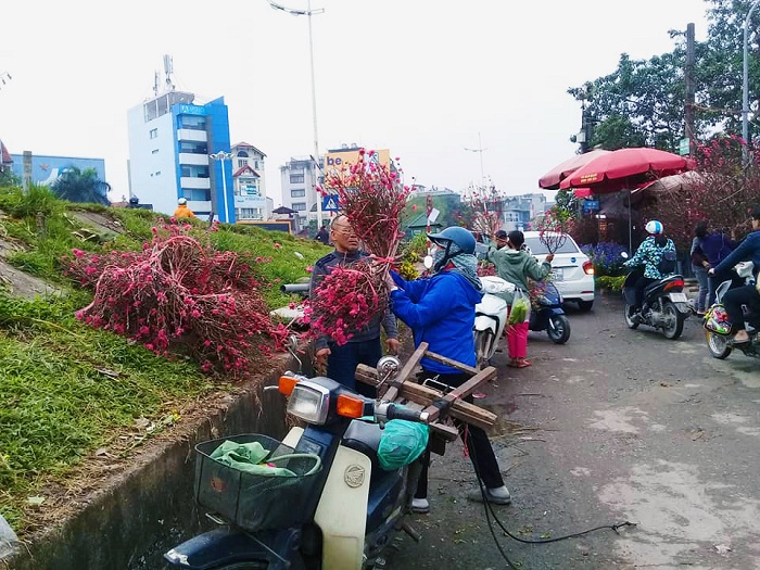 Các gian hàng bán hoa đào nở sớm với đủ mọi kích thước, thế cành và dáng khác nhau, trong đó có các loại đào như: Đào phai, bích đào, đào trắng, đào rừng… Những cành đào được cắt tỉa một cách gọn gàng, quấn dây, tạo khung để người mua chỉ cần mang về là có thể cắm ngay được vào trong bình.