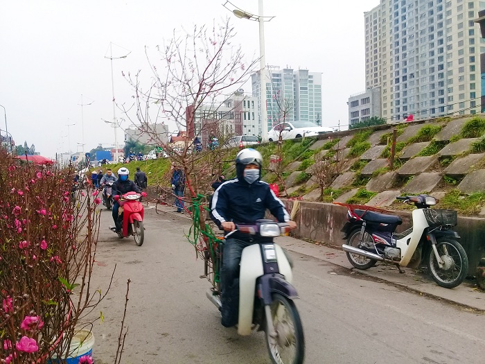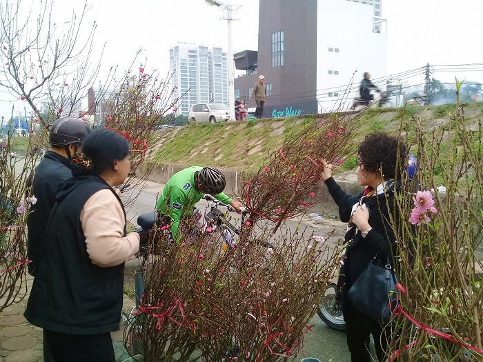 Những ngày gần đây, ở chợ hoa Quảng Bá số lượng người mua hoa đào nở sớm ngày một tăng lên, hầu như vào thời điểm nào trong ngày cũng có người đi mua đào cành nhưng vào buổi chiều tối, lúc tan tầm số lượng người mua đào mang về nhà để cắm là nhiều nhất.