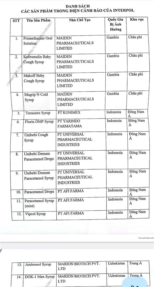 Danh sách 14 siro ho bị cấm (Ảnh chụp CV)