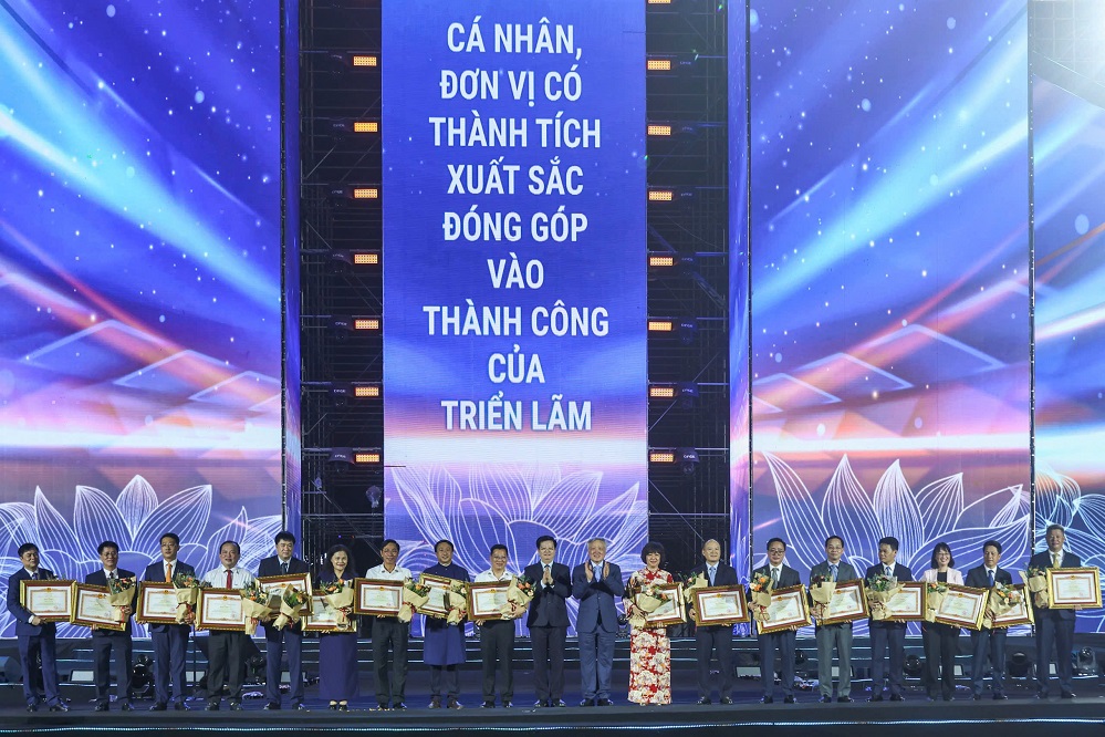 Phó thủ tướng thường trực Nguyễn Hòa Bình và Phó thủ tướng Mai Văn Chính trao Bằng khen của Thủ tướng Chính phủ và tặng hoa chúc mừng các đơn vị có thành tích xuất sắc tại triển lãm (ảnh: Tiến Dũng)