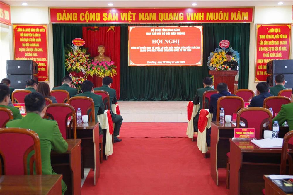 Tại hội nghị, đại diện Ban Chỉ huy Bộ đội Biên phòng tỉnh Cao Bằng đã công bố Quyết định số 6582/QĐ-BQP ngày 22/12/2025 của Bộ trưởng Bộ Quốc phòng về việc tổ chức lại Đồn Biên phòng cửa khẩu Trà Lĩnh; Quyết định số 3283/QĐ-TM ngày 23/12/2025 của Tổng Tham mưu trưởng Quân đội nhân dân Việt Nam ban hành biểu tổ chức, biên chế Đồn Biên phòng cửa khẩu quốc tế Trà Lĩnh thuộc Ban Chỉ huy Bộ đội Biên phòng tỉnh Cao Bằng. Đồng thời, công bố các quyết định đổi tên tổ chức đảng, tổ chức quần chúng của đơn vị theo quy định.