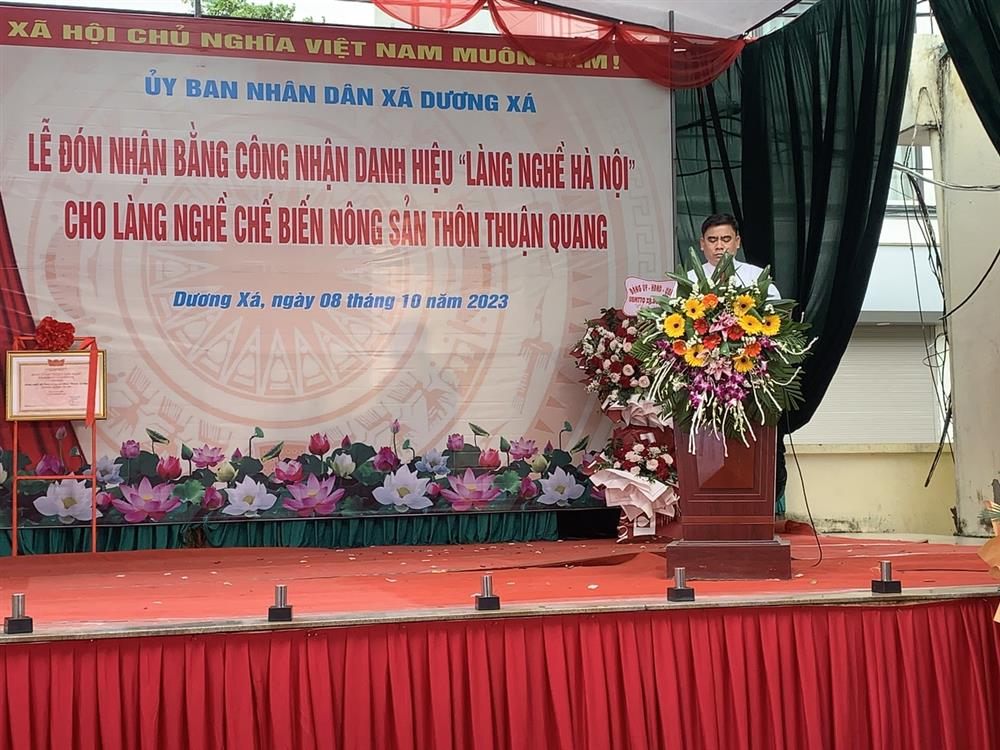 Phát biểu tại buổi lễ, Đồng chí Nguyễn Đức Hồng- Phó Chủ tịch UBND huyện Gia Lâm đã biểu dương, chúc mừng thành tựu mà nhân dân thôn Thuận Quang, xã Dương Xá đã đạt được, đồng thời mong muốn, làng nghề Thuận Quang tiếp tục bảo tồn, phát huy các giá trị của làng nghề truyền thống; phát triển làng nghề theo định hướng xây dựng nông thôn mới gắn với công tác quản lý môi trường và phát triển du lịch; thúc đẩy quá trình đô thị hóa và phát triển liên doanh, liên kết giữa các cơ sở làng nghề; bảo đảm sự tăng trưởng ổn định, lâu dài, góp phần xây dựng quê hương ngày càng khang trang, sáng - xanh - sạch - đẹp.