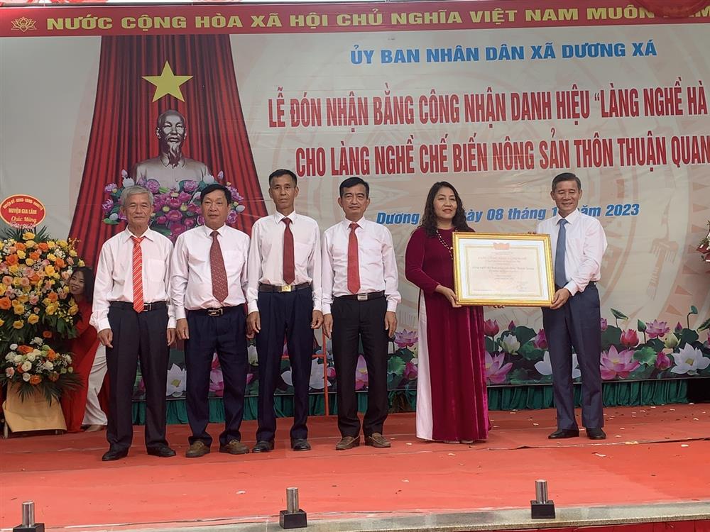 Với những thành tựu đã đạt được, ngày 11-8-2023, UBND thành phố Hà Nội đã ký ban hành Quyết định số 4038/QĐ-UBND, công nhận danh hiệu "Làng nghề Hà Nội" cho Làng nghề chế biến nông sản thôn Thuận Quang, xã Dương Xá, huyện Gia Lâm.
