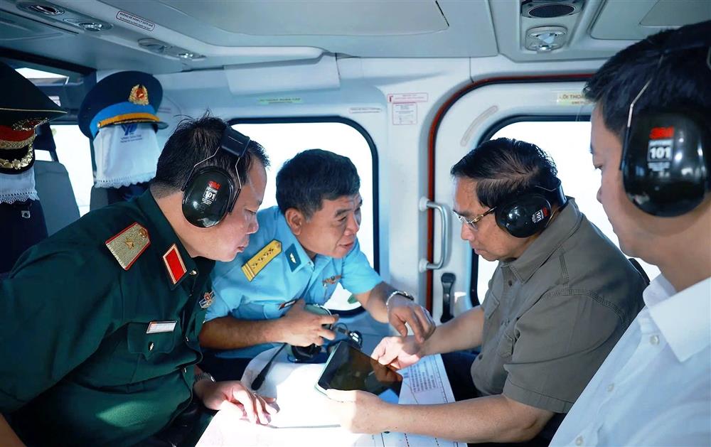 Thủ tướng và cán bộ đoàn công tác trên chuyến bay khảo sát.