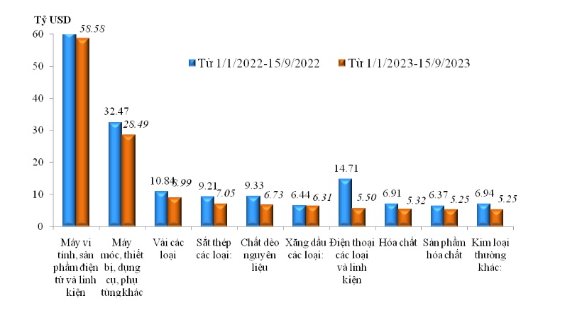 Trị giá nhập khẩu của một số nhóm hàng lớn lũy kế từ 01/01/2023 đến 15/9/2023 và cùng kỳ năm 2022.