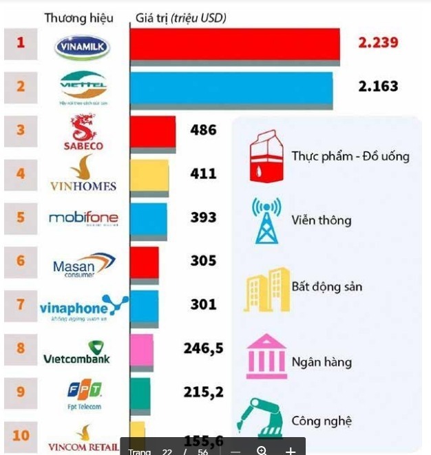 Trong đó, 10 thương hiệu dẫn đầu gồm các tên tuổi quen thuộc là Vinamilk, Viettel, Sabeco, Vinhomes, Masan Consumer, MobiFone, VinaPhone, Vietcombank, FPT và Vincom Retail, với tổng giá trị hơn 6,9 tỷ USD.