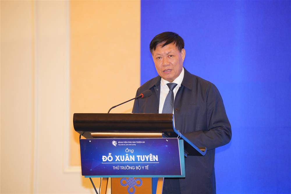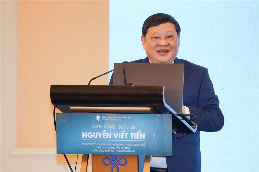 GS.TS.BS Nguyễn Viết Tiến - Giám đốc Bệnh viện Phụ sản Thiện An, Phó Chủ tịch Thường trực Hội đồng Y khoa Quốc gia, Chủ tịch hội Phụ sản Việt Nam phát biểu tại Hội nghị
