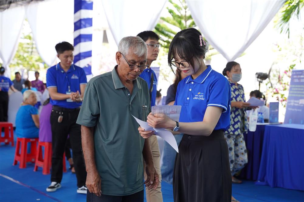 Nhân viên Long Châu tận tình hướng dẫn người cao tuổi trong ngày hội khám và phát thuốc miễn phí.