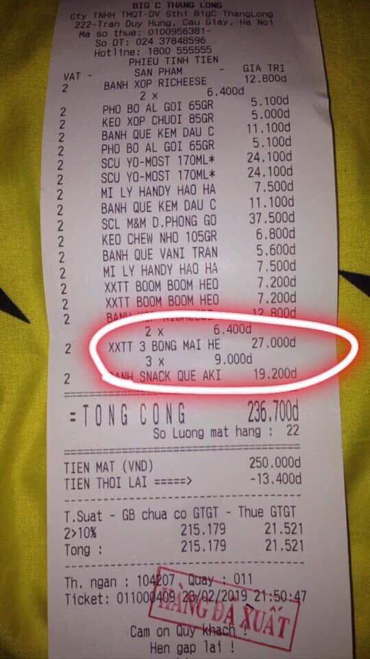 Hoá đơn mua hàng của chị D.N.O tại Big C Thăng Long