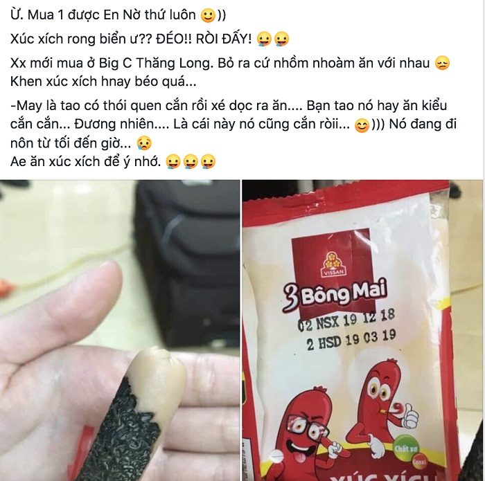 Sau khi có trải nghiệm không hay về sản phẩm xúc xích tiệt trùng của Vissan, bạn của chị D.N.O đăng tải trên mạng xã hội để cảnh báo với người tiêu dùng với nội dung: "Xúc xích mới mua ở Big C Thăng Long. Bỏ ra cứ nhồm nhoàm ăn với nhau khen xúc xích hôm nay béo quá... May là tao có thói quen cắn rồi xé dọc ra ăn.... Bạn tao nó hay ăn kiểu cắn cắn... Đương nhiên.... Là cái này nó cũng cắn rồi... Nó đang đi nôn từ tối đến giờ... Anh em ăn xúc xích để ý nhớ".