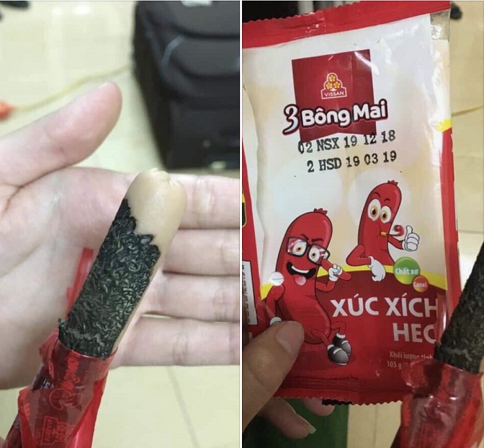 Bên cạnh đó chị D.N.O người có trải nghiệm với chính sản phẩm mình mua cho biết thêm sản phẩm xúc xích tiệt trùng Bông Mai, thương hiệu Vissan, mua vào ngày 23/2/2019, việc bảo quản không có vấn đề gì cho đến khi bóc xúc xích ra sử dụng. Trên bao bì của sản phẩm cũng ghi rõ ngày sản xuất từ ngày 19/12/2018, hạn sử dụng đến ngày 19/03/2019. Tức là sản phẩm tính đến thời điểm chị D.N.O sử dụng còn hạn gần 1 tháng. Nhưng không hiểu vì đâu sản phẩm xúc xích tiệt trùng Vissan được đóng gói cẩn thận như vậy đã có hiện trạng mốc đen, ôi thiu và đang trong tình trạng phân huỷ thành giòi bọ?.
