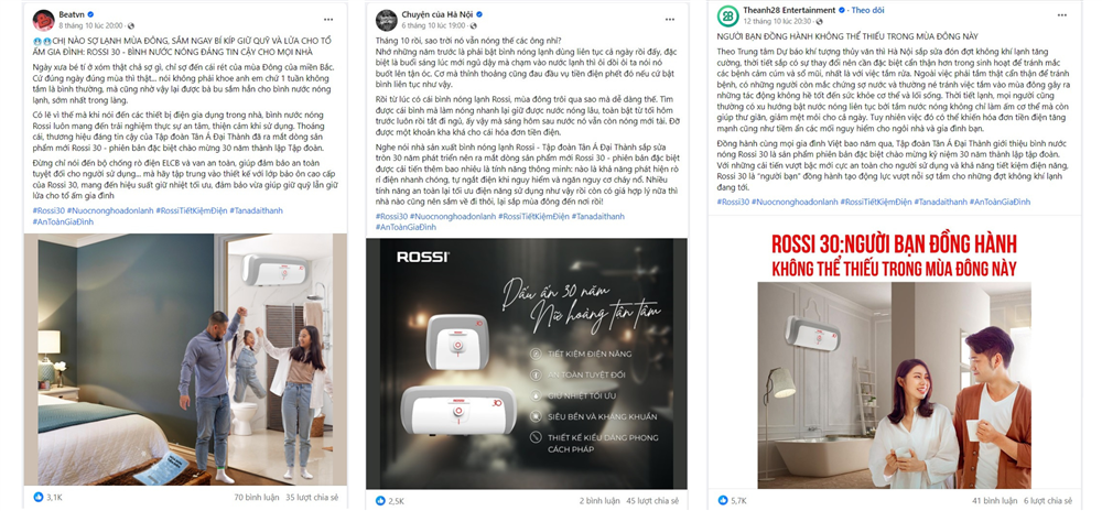 Gần đây, trên các trang cộng đồng hàng triệu lượt theo dõi như Beatvn, Theanh28 Entertainment, Chuyện Của Hà Nội,... “cư dân mạng” đã dành sự quan tâm đặc biệt đối với bình nước nóng Rossi 30. Sản phẩm được biết tới là phiên bản kỷ niệm 30 năm thành lập của Tân Á Đại Thành – Tập đoàn kinh tế đa ngành hàng đầu Việt Nam trong lĩnh vực Sản xuất công nghiệp - Công nghệ cao - Bất động sản.