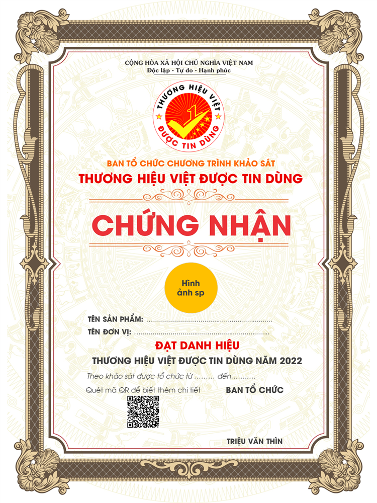 Mẫu chứng nhận sản phẩm đạt danh hiệu "Thương hiệu Việt được tin dùng"