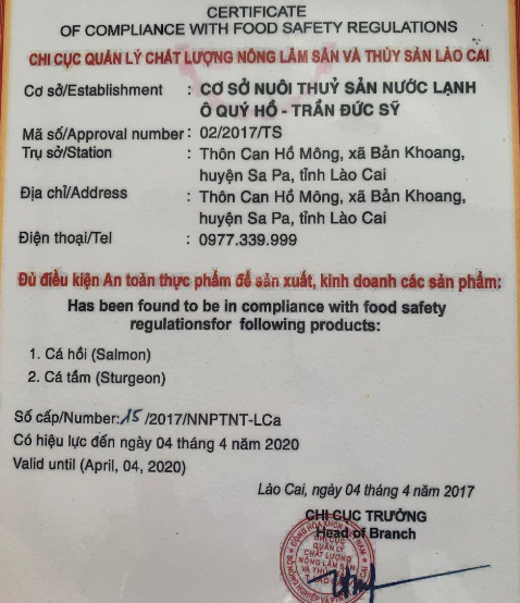 Cá hồi vân được nuôi đúng quy chuẩn và được chứng nhận sản phẩm an toàn của bộ nông nghiệp và phát triển nông thôn. Hiện tại, cơ sở ngoài bán sống, cơ sở tập trung xây dựng cơ sở vật chất, nghiên cứu sản xuất ra sản phẩm ruốc cá hồi và cá hồi hun khói. Để có thể đáp ứng những nhu cầu của khách hàng trên toàn quốc.