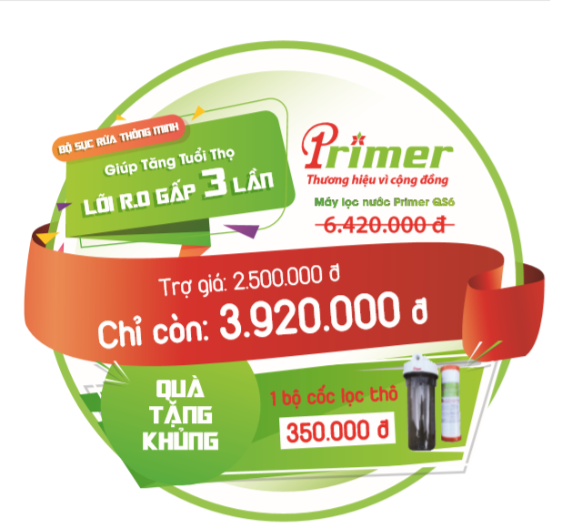 Primer trợ giá 2.500.000 vnđ Máy lọc nước QS6- công nghệ gầm bếp hiện đại. Chỉ còn mua với giá 3.920.000 vnđ áp dụng trên toàn quốc. Thời gian kết thúc trợ giá là 31/8/2020.