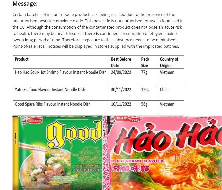 Ngày 20/8, Cơ quan An toàn Thực phẩm Ireland (FSAI) ra thông báo thu hồi một số lô sản phẩm mì ăn liền có chứa chất Ethylene Oxide. Đây là chất có hại cho sức khỏe con người và không được phép sử dụng trong thực phẩm phân phối tại Liên minh châu Âu.
