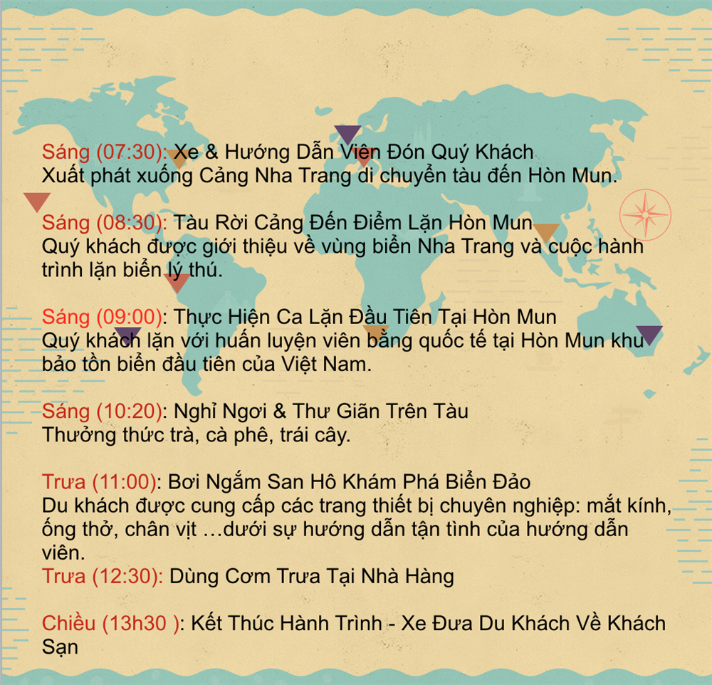 Hành trình lặn biển tại Hòn Mun Nha Trang thường kéo dài từ 7h30 sáng đến 14h chiều với lộ trình: