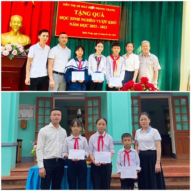 Ngoài công việc kinh doanh, Đại lý xe điện Phong trang thường xuyên làm công tác từ thiện và quan tâm nhiều đến các cháu học sinh có hoàn cảnh đặc biệt khó khăn vươn lên trong học tập