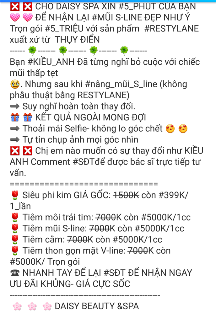 Vậy việc Daisy Beauty & Spa ngang nhiên công khai quảng cáo các dịch vụ vượt phép phải chăng là hành vi ham lợi nhuận, xem nhẹ tính mạng khách hàng?